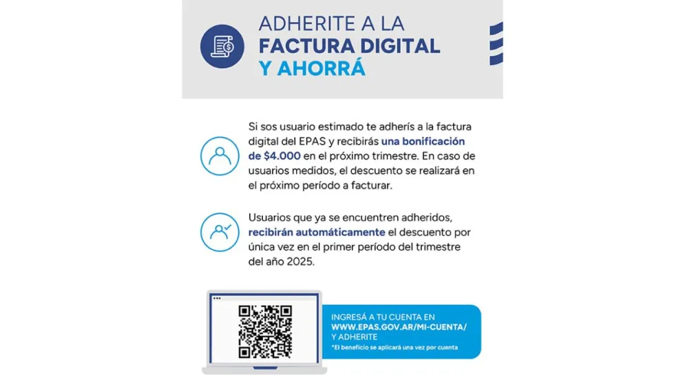 El Ente Provincial de Agua y Saneamiento (EPAS) ofrece un beneficio para todos los usuarios domésticos que se adhieran a la factura digital. El mismo fue aprobado por Resolución Ministerial, y tiene como ejes fundamentales el cuidado del medio ambiente, fomentar la despapelización en las oficinas e incentivar la migración de las relaciones y procesos entre el ámbito de la administración pública y los usuarios hacia un manejo electrónico/virtual.