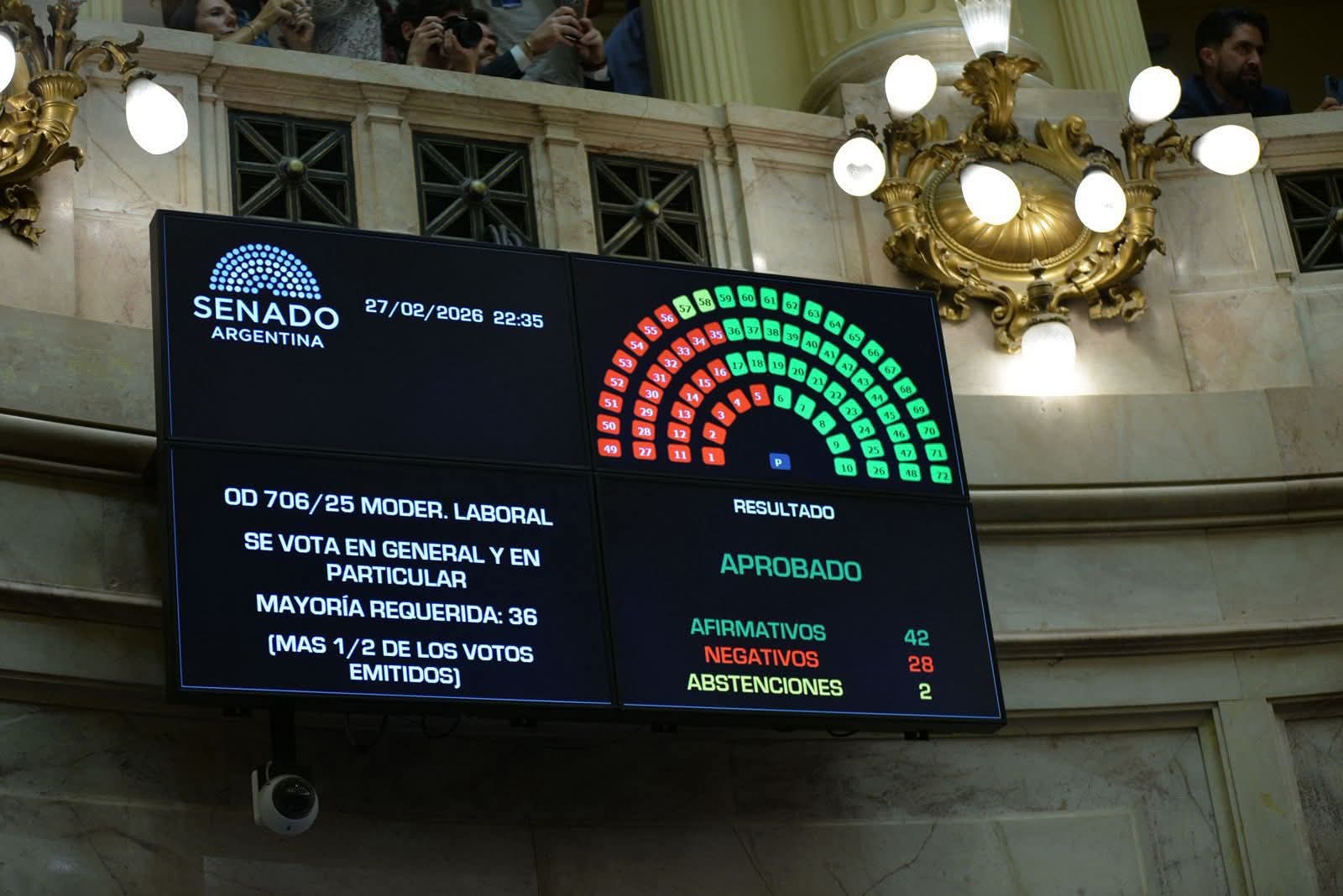 El proyecto de Modernización Laboral fue aprobado por 42 votos a favor, 28 en contra y 2 abstenciones, en una jornada que había comenzado con otro debate de alto impacto: la sanción del Régimen Penal Juvenil, que fija la edad de imputabilidad en 14 años y fue avalado por 44 votos positivos, 27 negativos y una abstención.