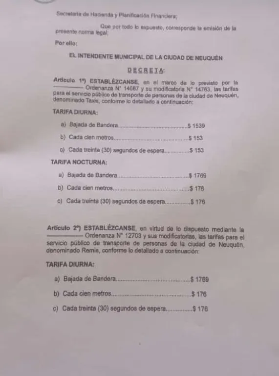Decreto: La medida se encuentra establecida en el Decreto 0165/25, que establece los nuevos valores para el servicio de taxi en Neuquén.