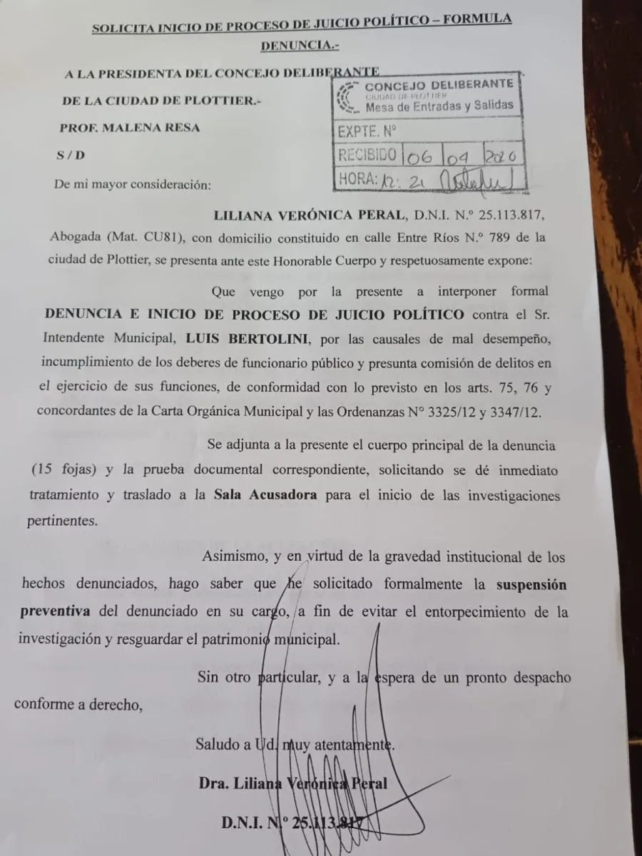 El Concejo Deliberante de Plottier recibió una presentación que solicita avanzar con un juicio político contra el intendente Luis Bertolini.