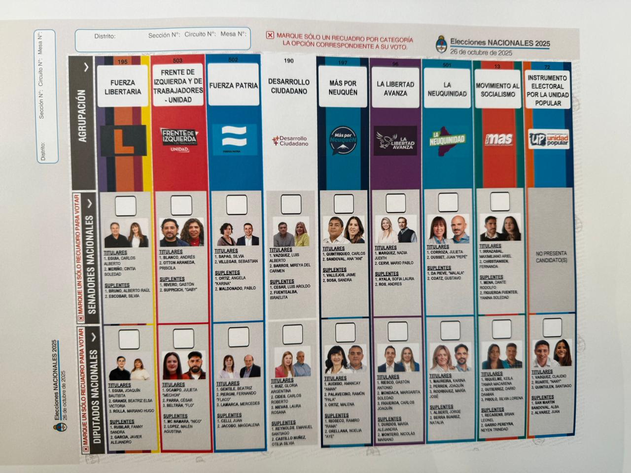 - Más por Neuquén (197): Senado: Carlos Quintriqueo y Ana Sandoval; Diputados: Amancay Audisio, Ramón Palavecino y Malena Ortiz.