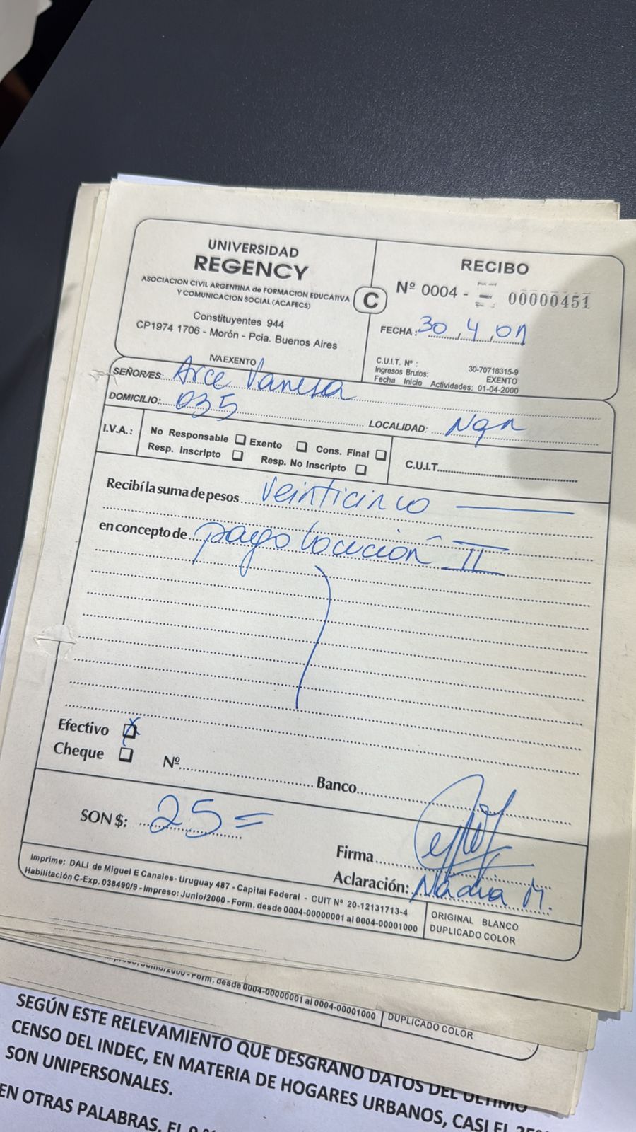 Arce conserva los recibos originales, fechados entre 1999 y 2002, y asegura que nunca recibió un reintegro ni explicación. “Invertí cuatro años de mi vida, pagué con sacrificio y me quedé sin nada. Era mi sueño, quería ser periodista”, afirmó entre lágrimas.