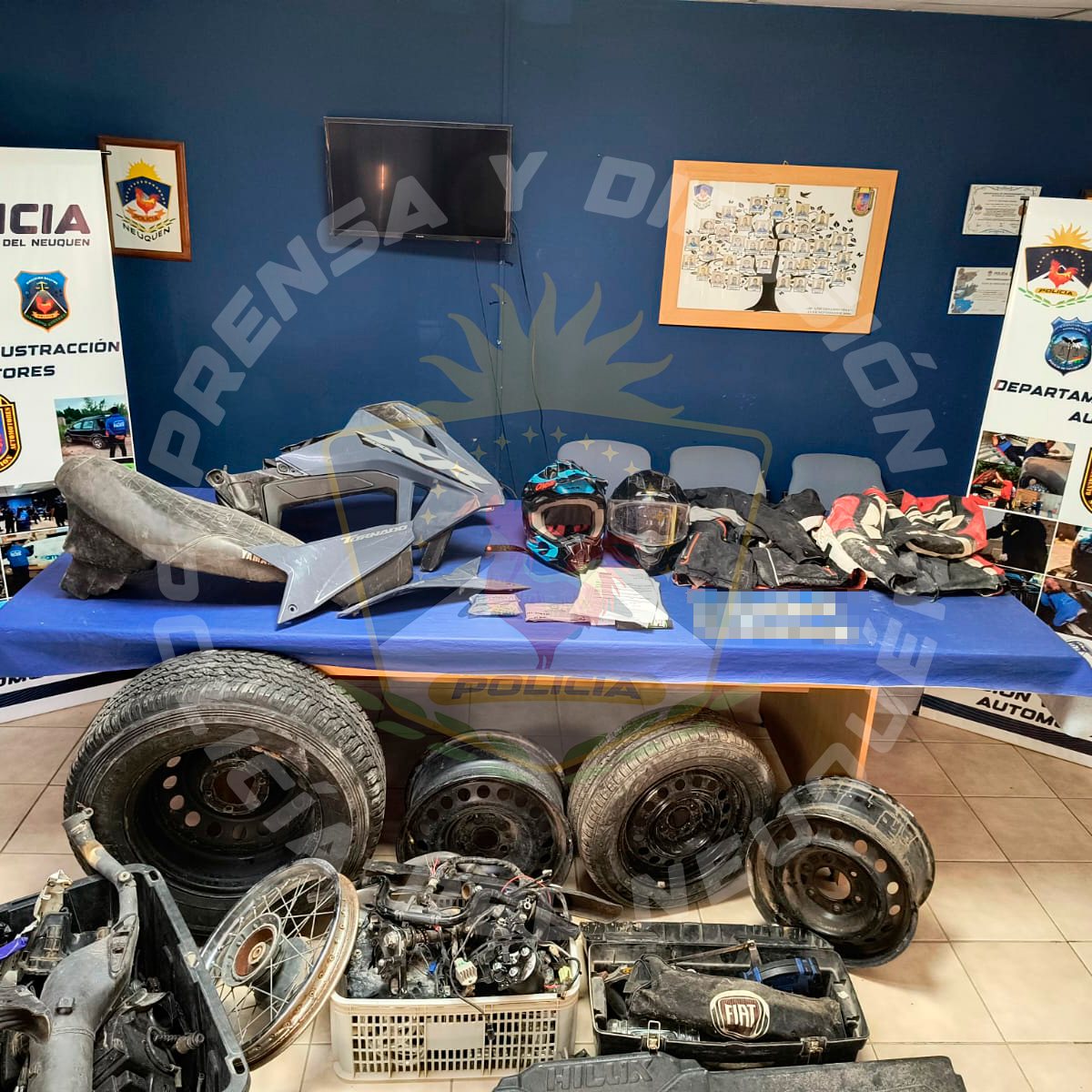 Durante el procedimiento se secuestraron gran cantidad de partes de motocicletas de distintas marcas, herramientas, elementos de seguridad vial, documentación de vehículos con pedido de secuestro y vestimenta posiblemente vinculada a otros hechos delictivos.