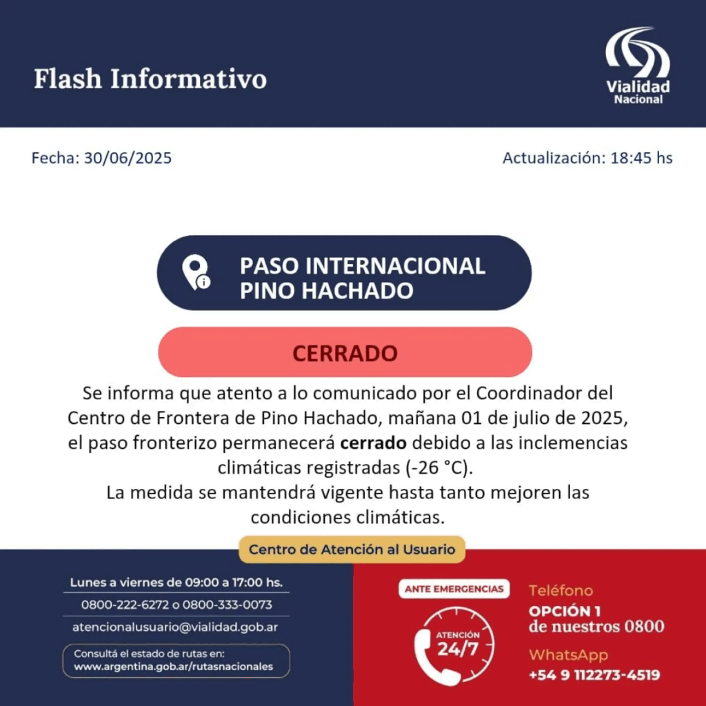 El Paso Internacional Pino Hachado permanecerá cerrado este martes 1° de julio debido a las condiciones climáticas extremas en la zona cordillerana, donde se registraron temperaturas de hasta -26°C.